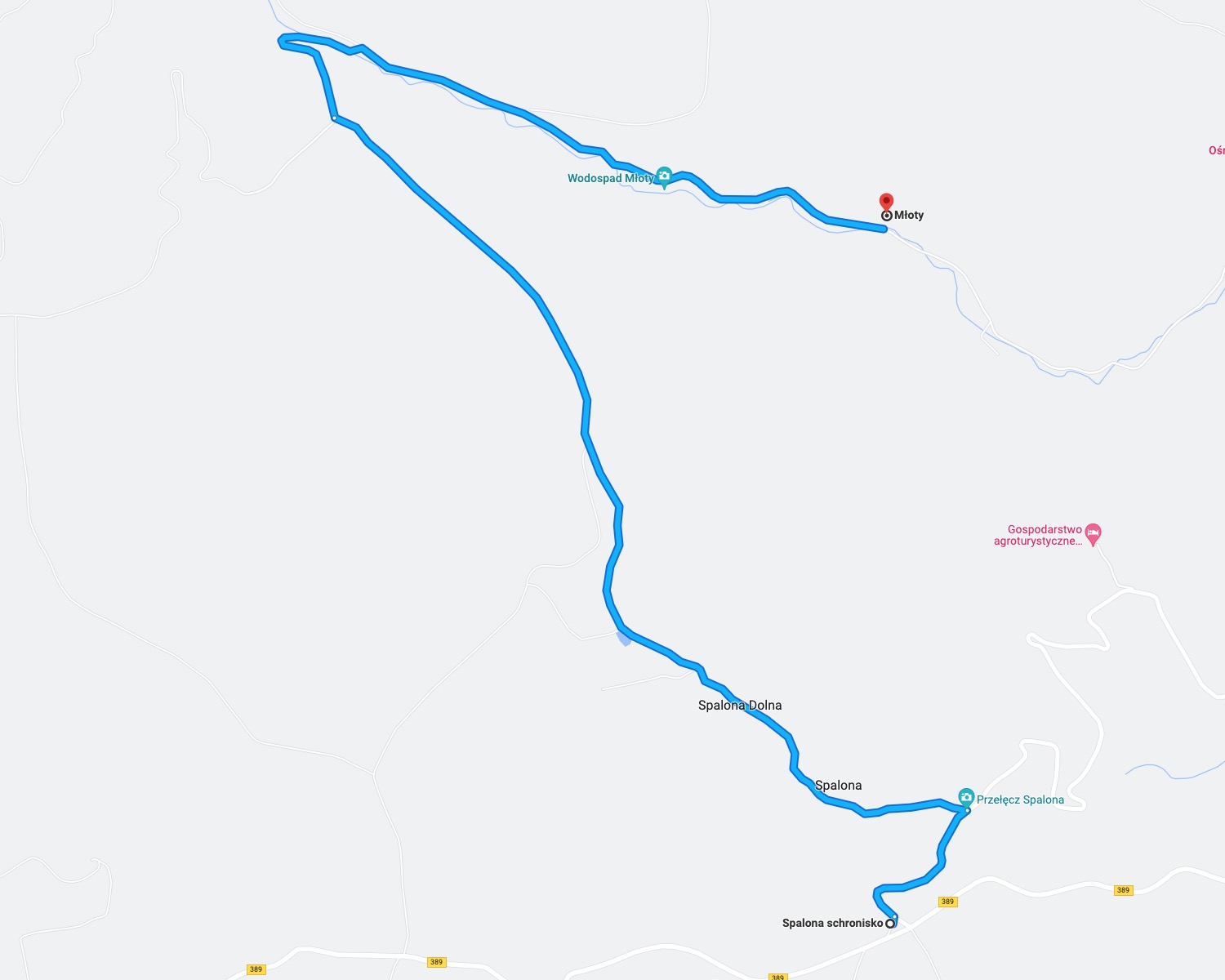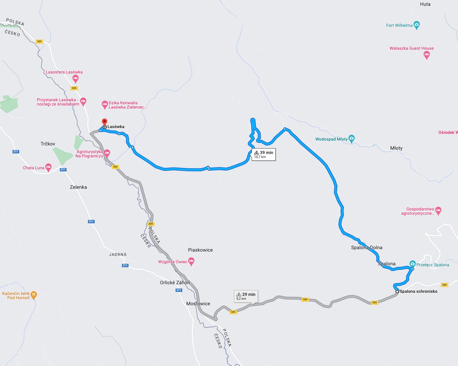 Dłuższa trasa prowadzi szlakiem zielonym ze Spalonej przez Osmelakową Dolinę do Lasówki, gdzie jest do wyboru kilka dróg (w sumie między 15 a 30 km łącznie z powrotem do Spalonej).