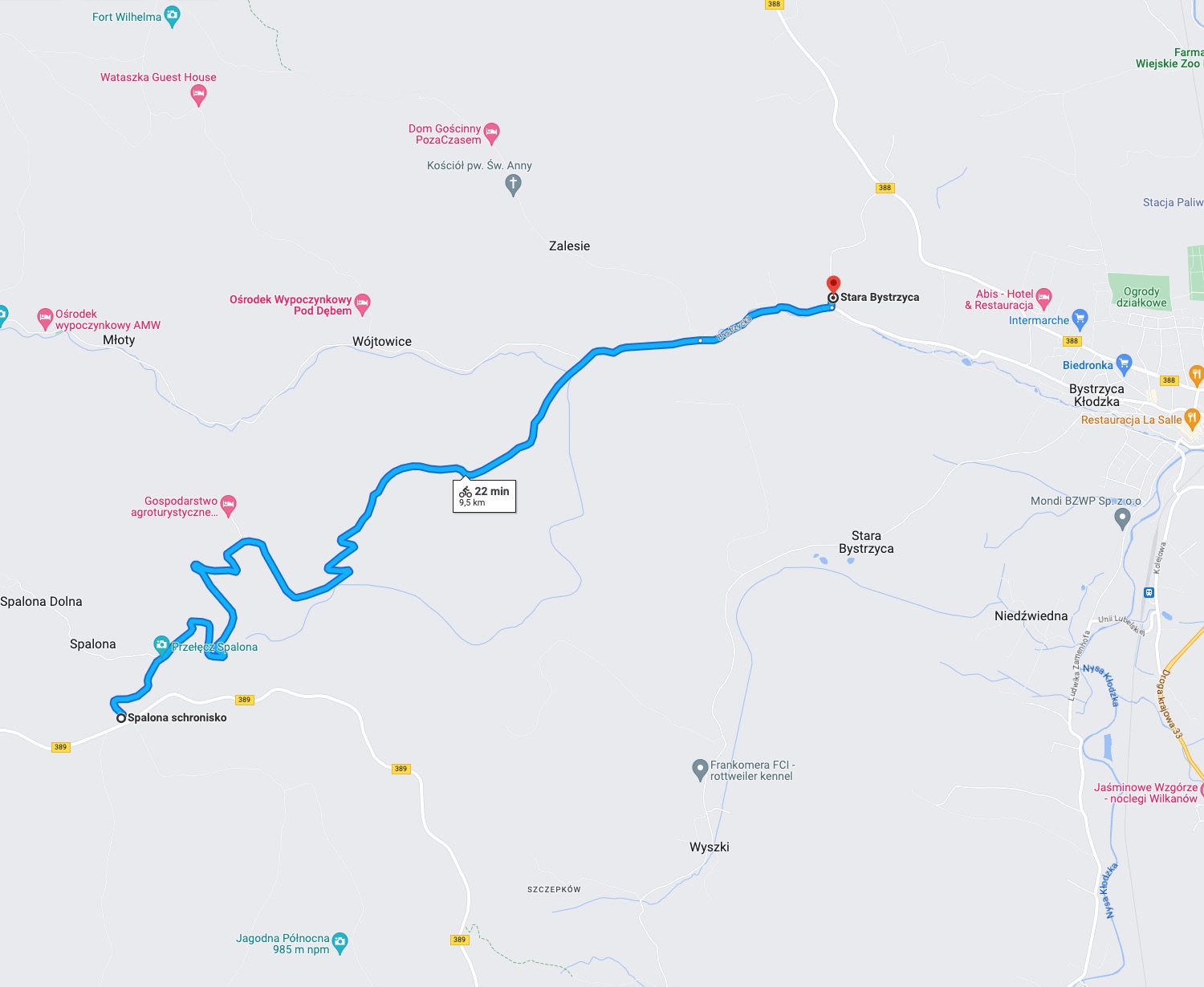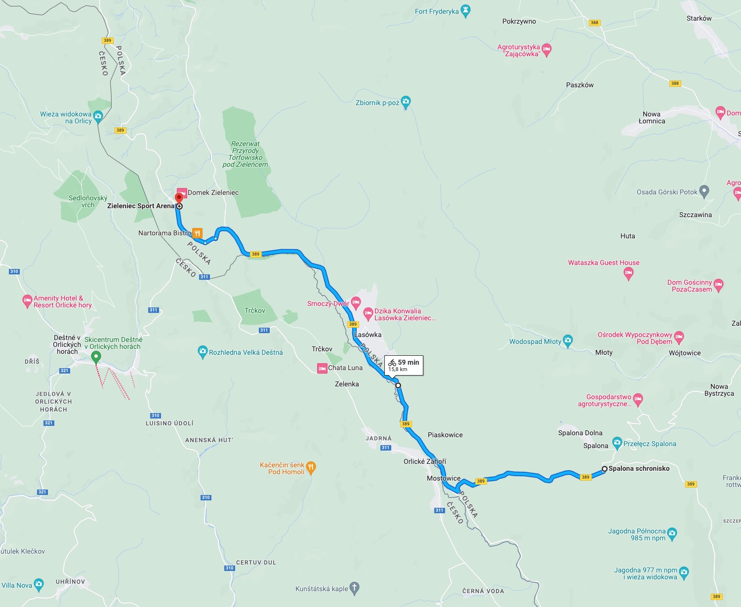 Po wyjściu z Apartamentu Spalona Sport należy skierować się drogą asfaltową w prawo -> Zjazd do Mostowic -> W Mostowicach na skrzyżowaniu trzeba skręcić w prawo -> Wzdłuż rzeki Dzika Orlica, przez Lasówkę -> Cały czas tą samą asfaltową drogą – aż dojeżdża się do Zieleńca -> Powrót tą samą drogą